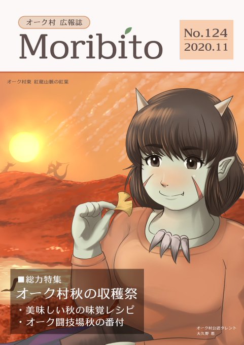 11月9日!今日はいいオークの日なので、オークの村の広報誌「Moribito」をデザインしてみました!この時期のオーク村は収穫祭が開かれ、特集も組まれているようです。表紙はオーク村出身のタレントの“大久野 恵さん”!! #いいオークの日 #イラスト #デザイン