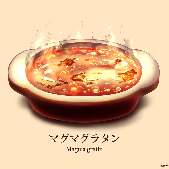 【異世界グルメ】マグマグラタン 4500kcal マグマの如く熱されたドラゴンブラッド入りの酸味の効いたトマトグラタン!洒落にならないくらいの熱さなので食べられる種族も限られるだろう。 #異世界グルメ #イラスト好きさんと繋がりたい #イラスト #illustration