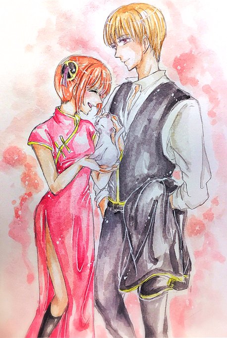 久しぶりの水彩🌸 ふと優しい目で神楽を見つめる沖田総悟、、