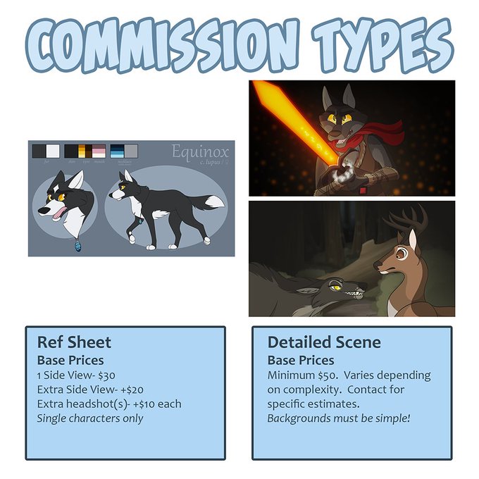 Below, you can find info and examples of the different types of art commissions I'm offering. For more info or further questions, please feel free to DM or email me.
