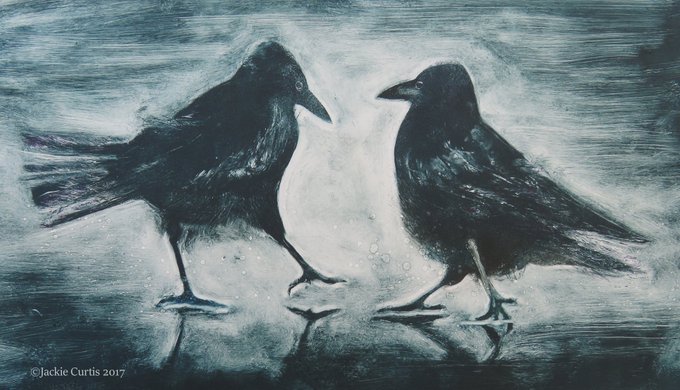 #AnimalMarch #CrowTalkHour 1st of 3 #Monoprints based on crows on Charmouth beach in the rain on Monday @NatureGreer