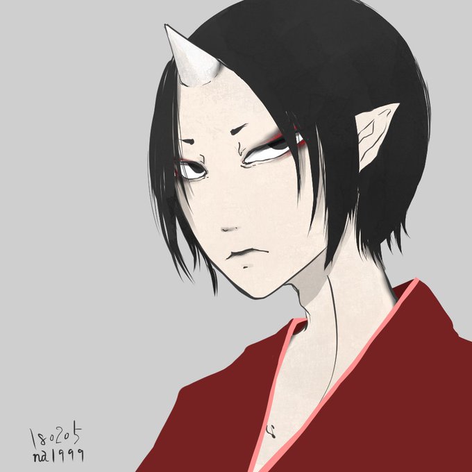 #リプきたキャラの顔だけ描く その③ そばをちゃん(@no_homo_no_Life )から鬼灯の冷徹の鬼灯 いわゆる「鬼顔」って最高に楽しいですね…吊り目、目元の赤色と口元、角、すべてが性癖に刺さる… 作品観たことないんですがずっとシリアス作品だと思ってました。だと思ってました。