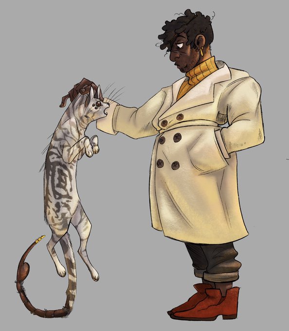 A new oc, Feli! He’s an old mech pilot who’s argumentative to a fault. Got the tail body mod in his 20s that was popular at the time but is now Super illegal