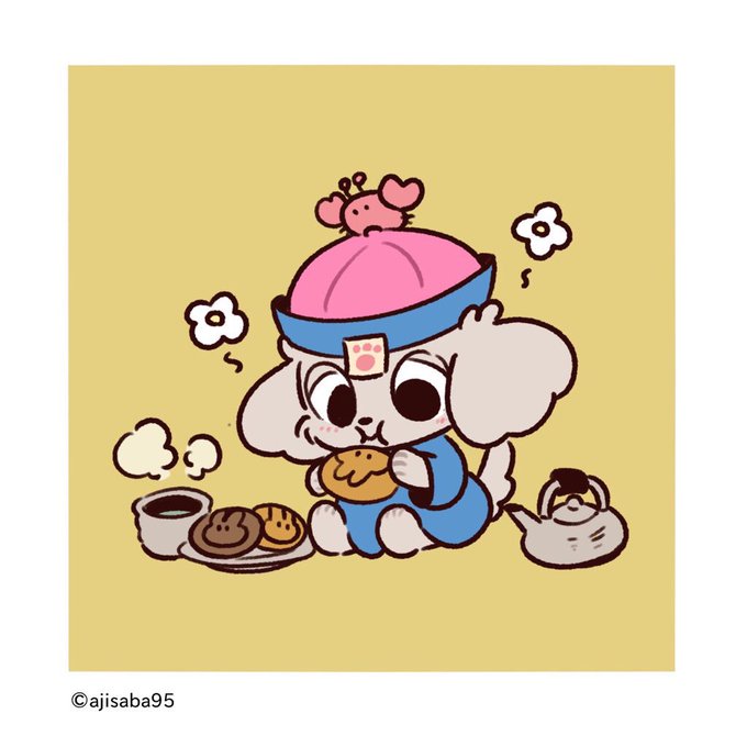 きょうはとっても おつかれさま ヴァンプードルちゃんに くっきーもらったの かにさんとくせいの おちゃもあるよ! まったりたいむ しよう! #キョンシーズー #1日1絵 #お疲れ様 #イラスト