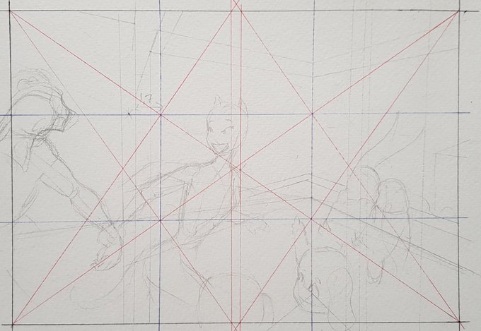 Sketch vs finished piece - I focus on the environment in accordance with composition basics and perspective, then semi improvisive the characters within that environment when I draw the pencils