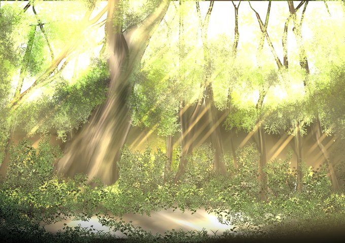 きれいな森林のイラストを今日見つけて描いてみたのやけど、毎度うーんってなるんですよ…中央の木と葉の位置が変な気がして表紙にはまだ出来ないし没で😅というか素材を買えばいい話なんだけどね😅
