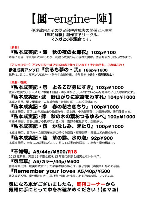 明日のコミックマーケット94、2日目土曜日西え16b【円陣】、戦国末期〜江戸初期伊達家(まさむねとしげざねメイン腐解釈有り)で参加しています!