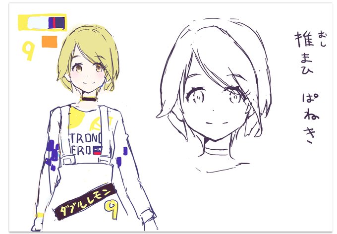 パネキさんのリクエストを忠実に再現した?パネキさんのマイキャラちゃん。名前と服は絵に出ないので適当です。推しであるまひろさんと同格にならないように気を付けました。私服っぽいのも顔の大きさやキラキラの量が若干違うのもそのせい。