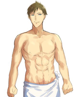 ニアが細め、比護さんは筋肉あるけど乗馬用でゴリゴリじゃない、エビくん実は胸筋ある、テュールは剣士なので割としっかりめっていうふんわり設定あります