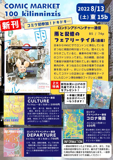 【コミケのお品書き】新刊は『雨と記憶のフェアリーテイル』帰国鬱をテーマにした実体験ベースのフィクション漫画です。購入特典で虹色に輝くキラキラポストカードと本編に関連するチラシがつきます、念願の初参加です。何卒よろしくおねがいします…!熱中症対策がんばります。。。