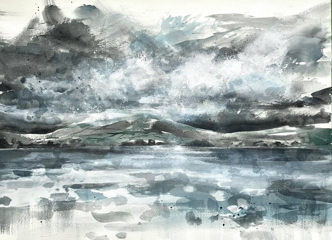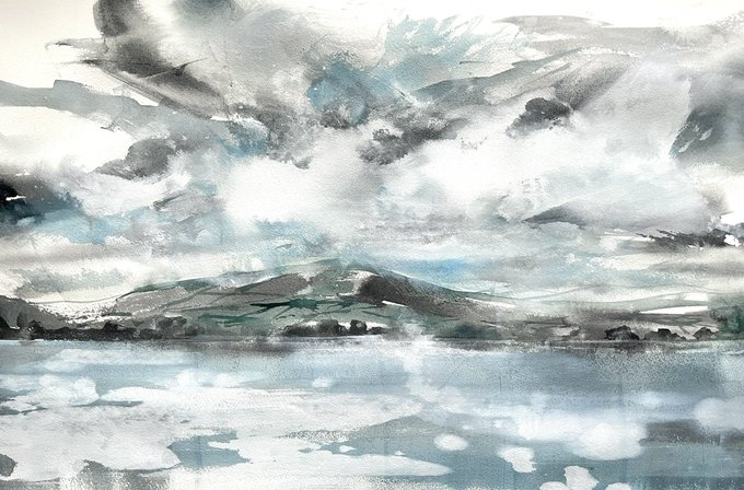 My first afternoon painting in the studio for a while. I am loosening up with some large acrylic ink on watercolour sheets 57x77cm. This one’s called “90% cloud cover”