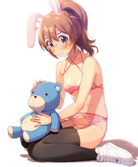 パンツをはかせてもらえなかったこのみさん… #裸の推しにフォロワーさんから言われたものを足してく 眼鏡/うさみみ/スニーカー/見せブラ/ガーターベルト/ジョーイくま/ニーハイ/ポニテ/二丁拳銃(ど~こだ?)