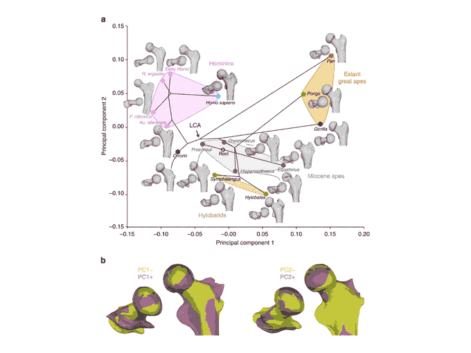 A 2013 analysis by @AlmecijaSergio and coworkers put the Orrorin femur into context of Miocene apes, fossil hominins, and living apes. Chimpanzees and gorillas diverge strongly in their femoral morphology from their close living and fossil relatives.