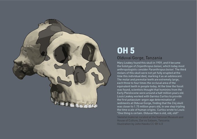 The 1959 discovery of the OH 5 #hominin skull led to the first K-Ar age determination of sediments at Olduvai by Garniss Curtiss. Finding them to be 1.75 Ma—triple the expected age—he wrote: "One thing is certain. Olduvai Man is old, old, old!" #paleoanthropology #FossilFriday