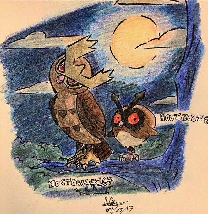 Stalking at night on #day5 of my #Pokémon art challenge are Hoothoot and Noctowl.
