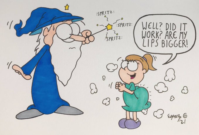 An ancient Sorceror is casting a spell and looking nervous as something bizarre emerges from the smoke. Amy wanted bigger lips, but sadly chose the wrong wizard!