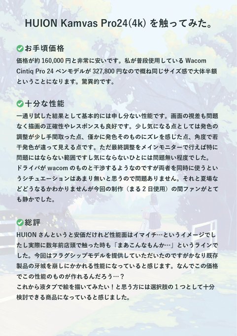 HUION様より液晶タブレットKamvas Pro 24 (4K)を提供していただいたので制作したイラストとレビューです。デジタルイラストもさまざまなツールが検討出来るようになってきましたね😌
