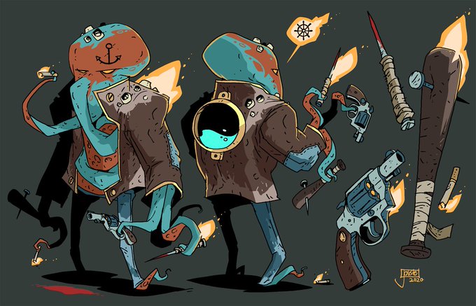 It's another awesome aquatic adversary from those dockside destroyers, The Portholes! The muscly Maulluscus wields a staggering amount of dangerous gang weapons among his nicotine fueled tentacles and is always up for a nasty fight! #characterdesign