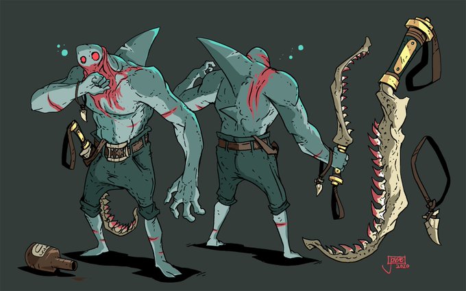 This sharkman has had his mouth flesh-blasted off by a cruel wizard. Without a maw of his own, he now fights with a jawbone sword and is very self conscious about his injury!