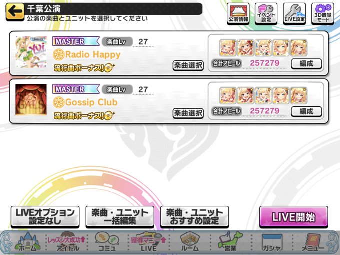 ちょっと気になってたのでやってみてる😌キャラとか曲もほとんど知らなくて‥最初にきたSSRの子が今回のイベ報酬の子と同じチームらしいので戦力強化にお迎えしたいとこなんやけど割としんどいぞ‥