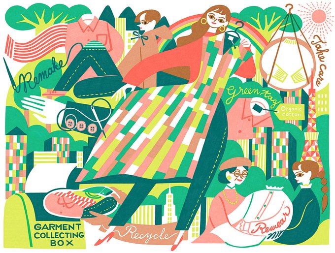 サステナブルのための行動って特別なものではなく日常の中にあるよ、と行動を目立たせるのではなく日常に溶け込ませるように描いて表現しました。