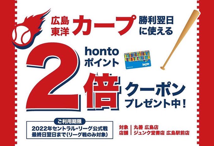 ジュンク堂書店広島駅前店、丸善広島店ではカープが勝った翌日はhontoポイント2倍クーポンを配布中。