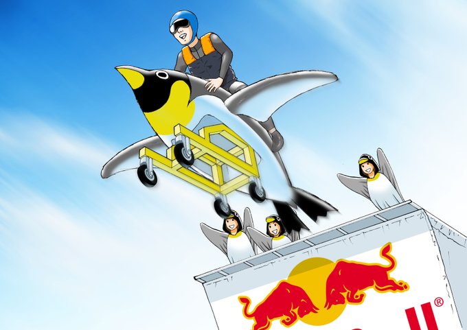 昔、レッドブルのボックスカーのジャンプ台から飛び出すヤツ(名前失念)にエントリーするチームから依頼されて描いたペンギンの乗り物の図と、飛んでるところのイラスト。