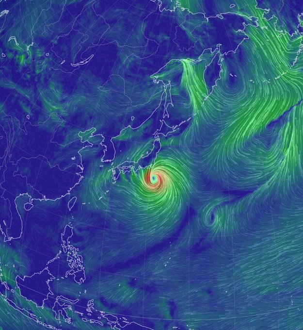 台風の中心から見て右側が強風域です。10/1お昼の台風の位置も載せておきます。「earth::」というサイトで風が動いている様子を見ることができます。面白いので是非見てみて下さい。