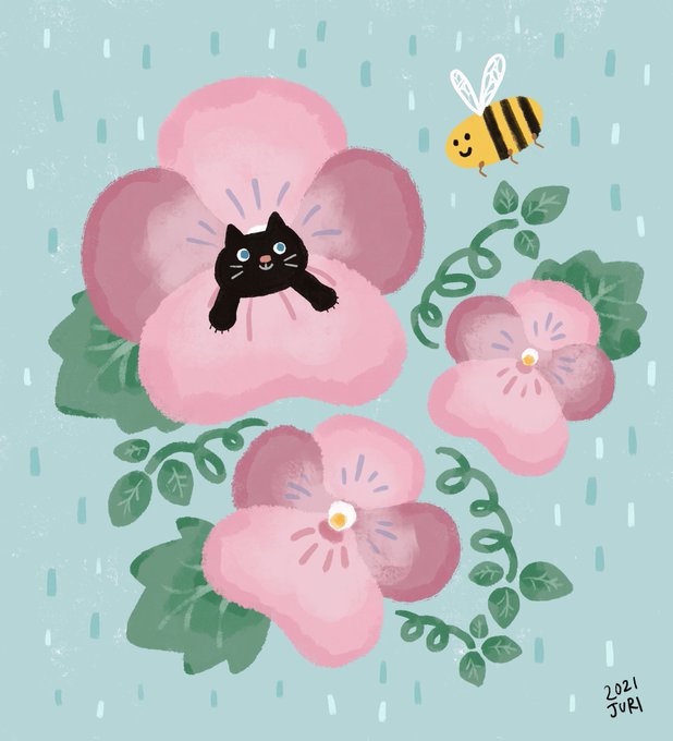 タイトルは「パンジー畑の猫とミツバチ」。