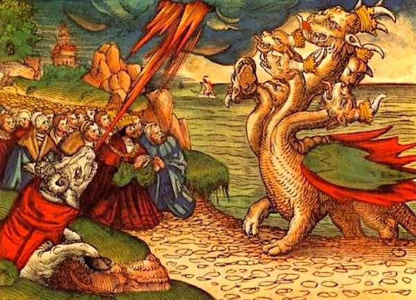 また私は見た。海から一匹の獣が上って来た(中略)その頭のうちの一つは打ち殺されたかと思われたが、その致命的な傷も直ってしまった。 そこで、全地は驚いて、その獣に従い、そして、竜を拝んだ。(黙示13.1-) →
