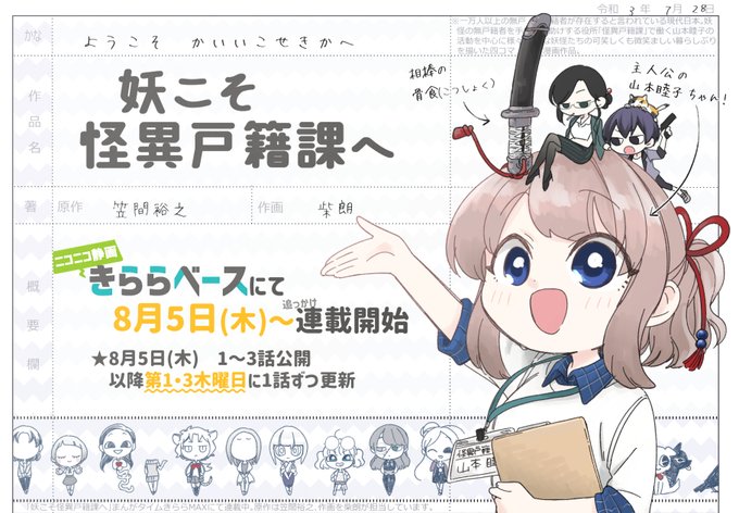 明日は木曜日!きららベースの『妖こそ怪異戸籍課へ』の追っかけ連載は来週8月5日(木)から始まります。