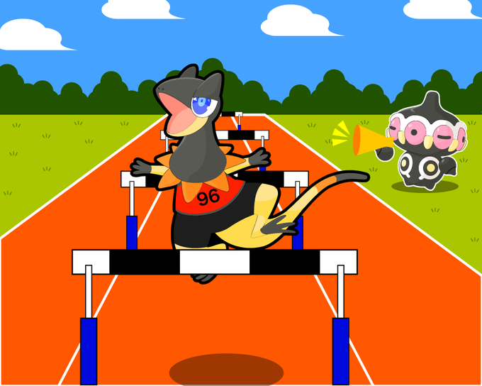 ハードル走に励むエレザードと応援するドグウさん。新規立ち絵はゼッケンエレザード!