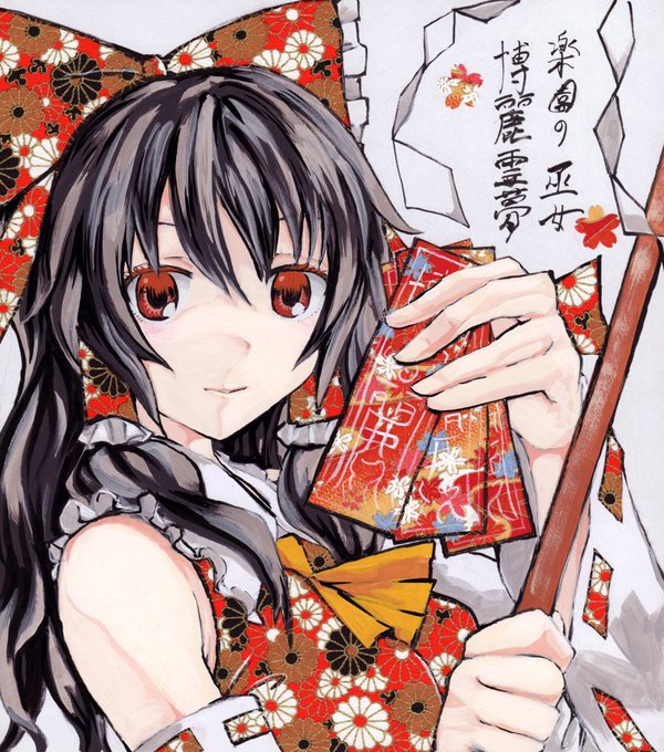色紙に博麗霊夢さん。基本アクリルで着色して服の赤い部分は千代紙を貼ってみました。原画は千代紙がキラキラしてて気に入ってます。千代紙シリーズは例大祭までにもっと増やしたいです。
