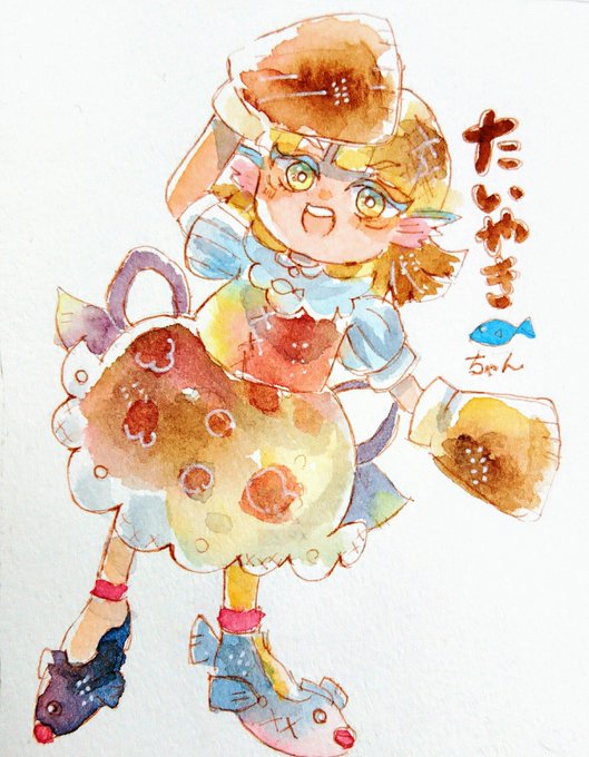 新しい擬人化ちゃん たいやき姫って呼びたい。たいやきちゃん🐡 ヒレのような鍋つかみ型の手袋をいつもしてる。 ほかほかあたたかい #水彩 #創作