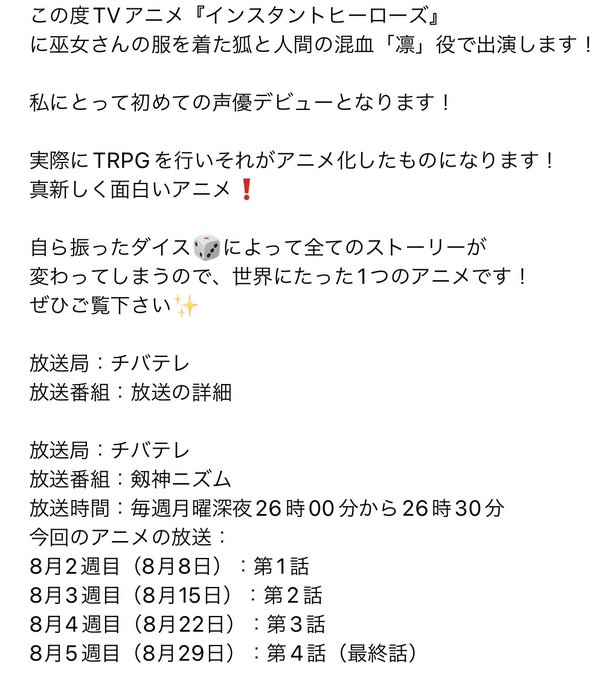 【ご報告】声優デビュー👏 ↓↓↓↓↓↓↓↓↓↓↓↓↓↓↓↓↓↓↓ ✿cast✿ 声獣しぃにゃん役 声獣しぃにゃんさん@sinyan_genki 鏡視レイ役 常田ひとみさん ミヤザワカナデ役 薫さん@n_kuyura にゃんころ役 ゆりなさん 凛役 姫奈楓@kaede__0119_ @chiba3ch #TRPG #声優 #女優 #アニメ