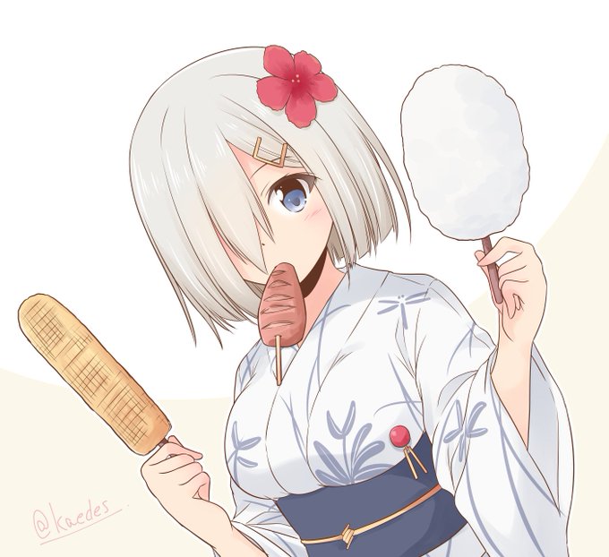「提督もひと口…どうぞ」 #艦これ版深夜の真剣お絵描き60分一本勝負 #艦これ版真剣お絵描き60分一本勝負_20210211 #浜風 お祭り浜風 1.5ドロくらい。言った後で照れる展開。