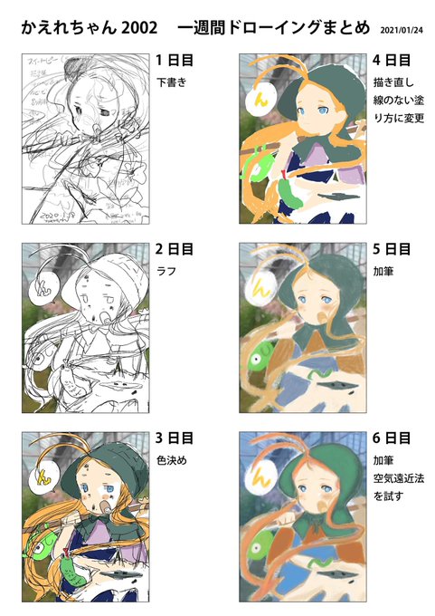 一週間かけてリサーチをしつつ描きました、ラフは2つ描いていたのですが、今回は1つ目の絵を描き上げました 1枚目が一週間の経過の様子です
