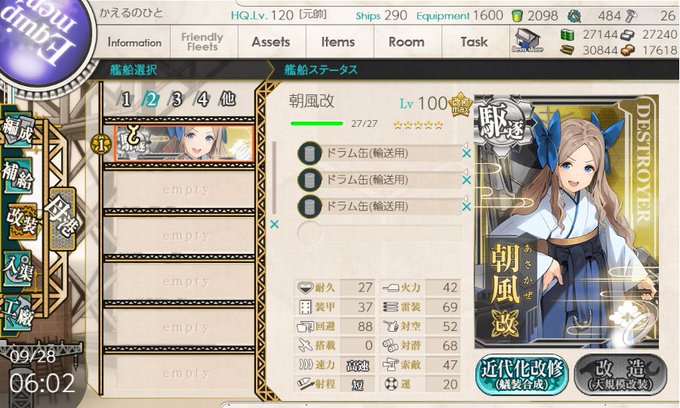 東急で気づいたら99になってた朝風 運+6 (東急駆逐第二世代の神風型1人目。第一世代は睦月型) #艦これ
