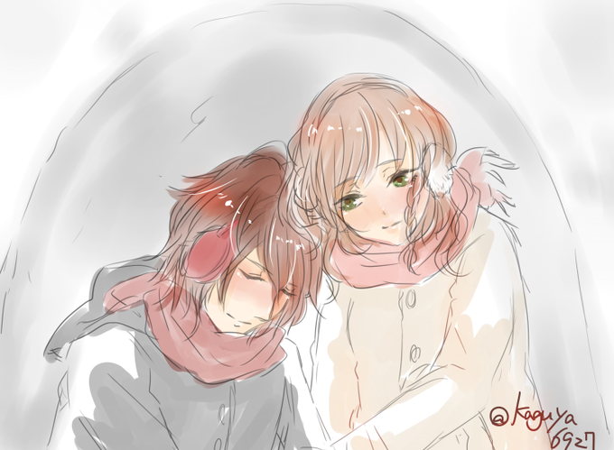 シチュお題:かまくら でシンと主人公ちゃん描きました。手が痛過ぎて線がガクガクしてる #アムネ版深夜のお絵描き60分一本勝負