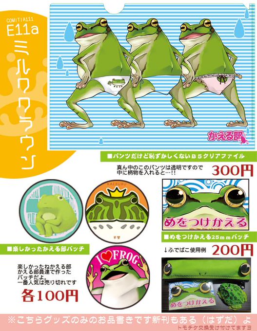 コミティアの新作じゃないカエルグッズだけの売り物を表記してみたんだ。でもかえる部じゃないのですよ メイン新刊は相方の本だよ!コミティアだけどトモチケ交換もするよ!