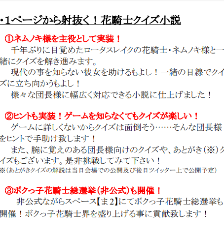 新刊『1ページから射抜く!花騎士クイズ小説』のあとがき問題の解答です。また新刊・既刊含め何か気になる点がございましたらお気軽にお声掛け下さい!皆様のお陰で今回も楽しくイベントに参加できました。改めてありがとございます! #じゃぶマイ支援