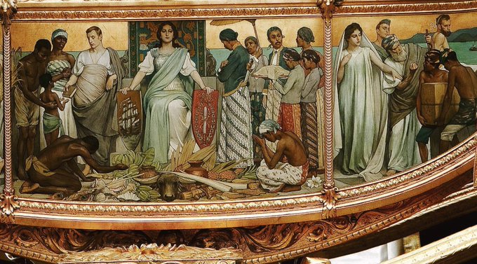 It's the royal vehicle of the Dutch king & queen with on it a glorification of the subjugation of African slaves & Indonesian colonial subjects by a white ruler.