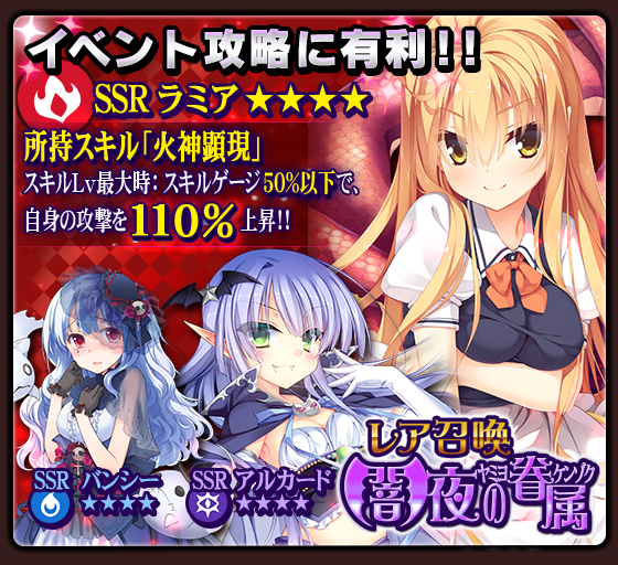 【新イベント】11/13より新イベント「吸血鬼の事情」が開始となります。召喚ラインナップも更新「レア召喚・闇夜の眷属」ではこぶいちによるラミアの他、バンシー、アルカード等の新カードが排出されます!