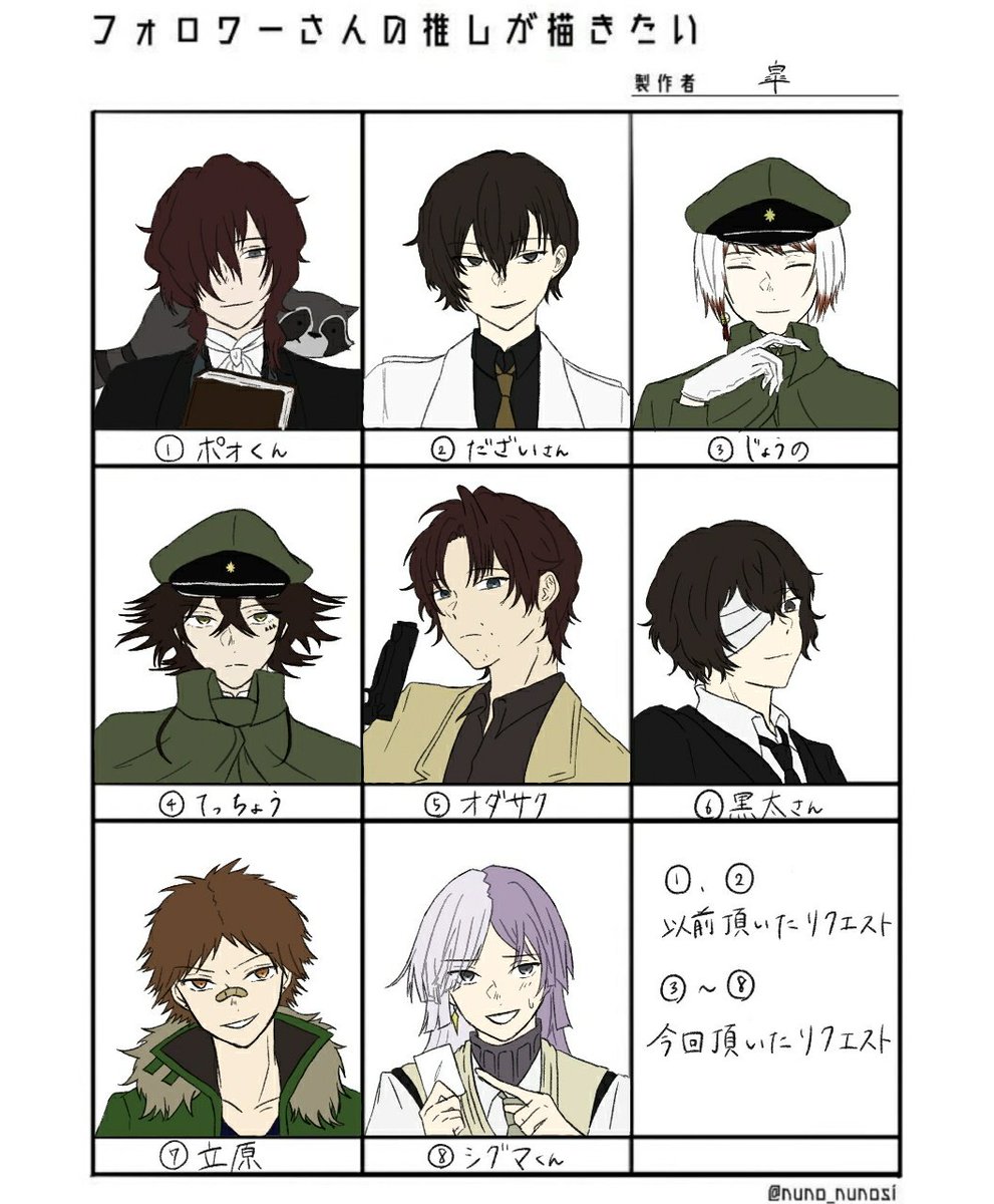 お待たせ致しました!!推しを描かせて頂くやつです!!普段描かないキャラも描くことができ、とても楽しかったです!!!ご協力下さった皆様、ありがとうございました~!!!!!