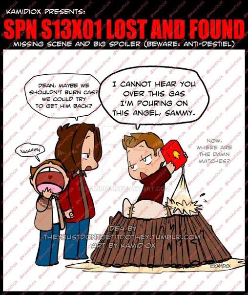 Lol I just found these two drawings I rejected for the comic I made for season 12x01! Dean hugging his mom (yeah, we yet didn't know) and killing Cass for not taking care of his baby bro.