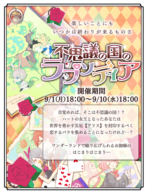 【告知】遂に開催★アリスイベント『不思議の国のラプソディア』!!早期特典報酬には、とってもかわいい茨木のミニぬいぐるみが!ランキングにはそれぞれのキャラたちとの個別エピソード!?ランキング上位報酬にはとってもかわいい背景も!