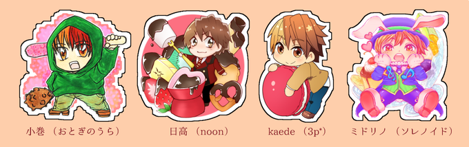 イベント会場頒布のみとなりますが、ノベルティはアクリルキーホルダーが4種類となりました!(ランダムで1つおまけとして付きます!)絵柄は小巻様、日高様、kaede様、ミドリノとなります。デフォルメ神峰くん&お菓子でお願いいたしました♡可愛いヤッター!!