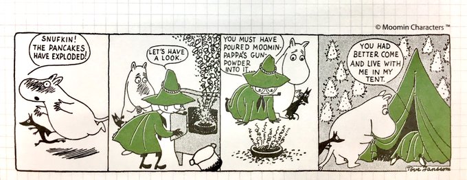 可愛すぎてまとめ買いしたムーミンのメモ帳気に入ってる。 これはケーキ焼くの失敗した?じゃあ俺のテントに来いよってなってるイケスナフキンの図です