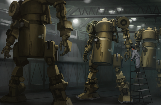ドイツ軍の南極工場で製造されるⅣ号人型重機。人型重機(Riesen Panzer)は第二次世界大戦中、ドイツによって開発された人型歩行兵器です。#人型重機