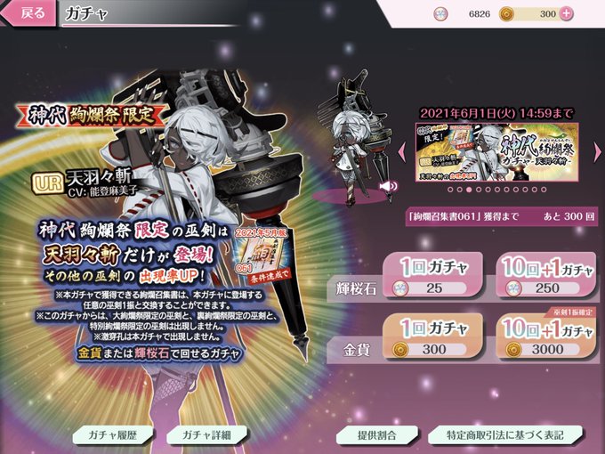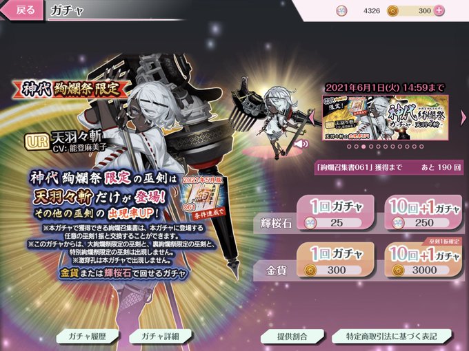 天羽々斬の復刻は半年待ってた、ようやく来てくれて嬉しい。 天叢雲剣にチャレンジする勇気(石)がない…